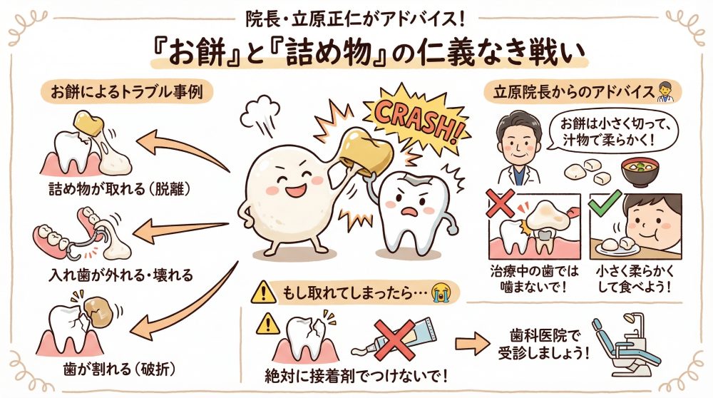 「お餅を食べるなとは言いません。しかし、治療中の歯や、長年使っている詰め物がある場所では、なるべく噛まないように意識してください。小さく切って、汁物に入れて柔らかくしてから食べるのがおすすめです。美味しく食べるためにも、工夫が必要ですよ」