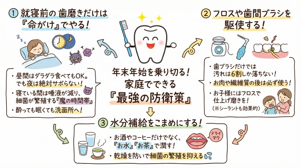 年末年始、美味しいものを囲んで家族団らん……そんな幸せな時間を「歯の痛み」で中断されないよう、日々のケアを少しだけ意識してみてくださいね。